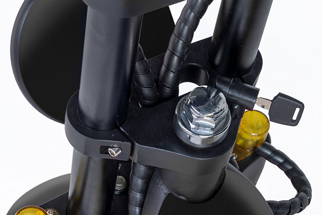 Wir haben viele Maßnahmen ergriffen, um Diebstahl zu verhindern. Neben der Alarmanlage der Klasse 3 und dem Anti-Diebstahl-Radschloss ist jeder E-Roller mit einem Lenkradschloss und einem separaten Schloss am Batteriekasten ausgestattet.